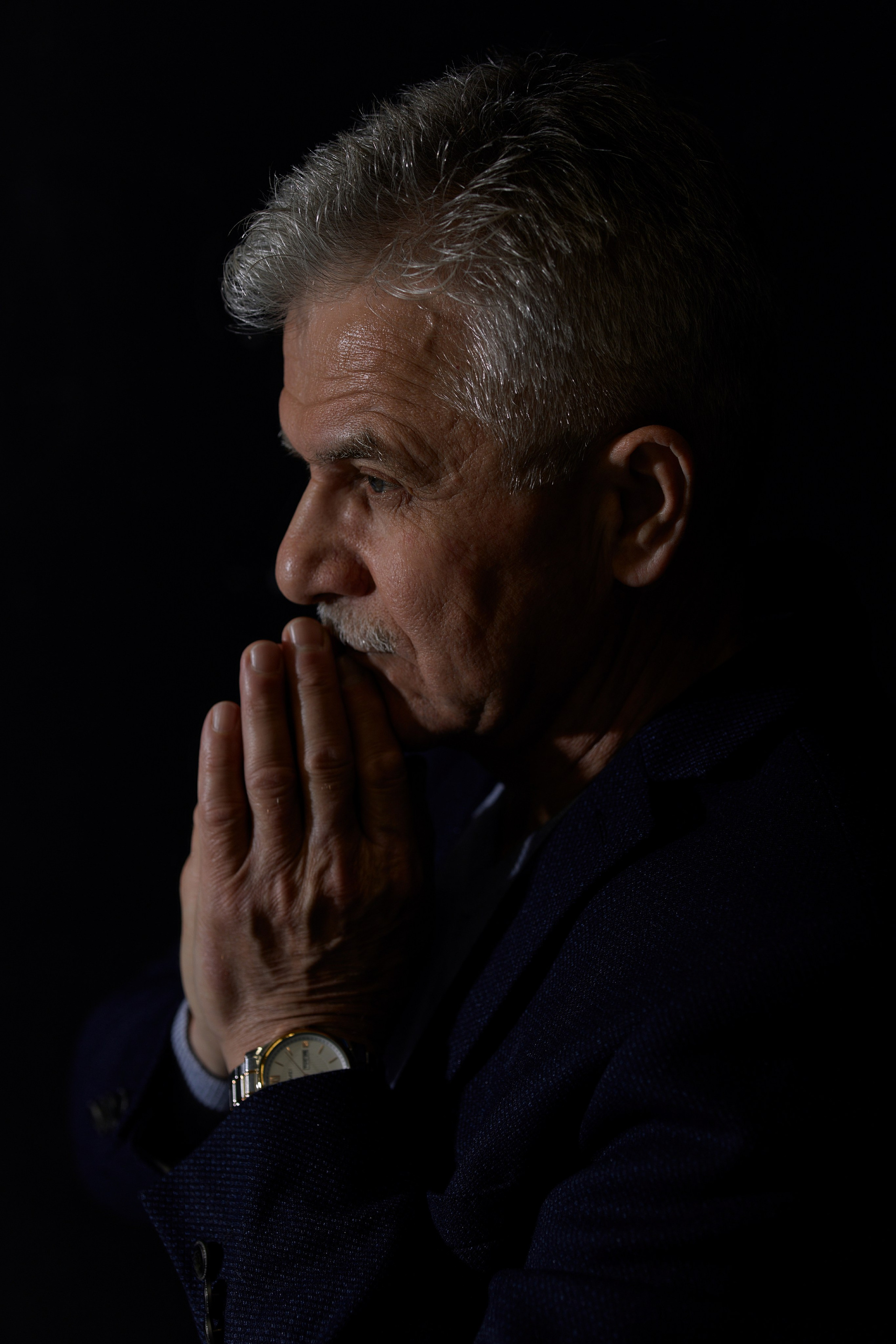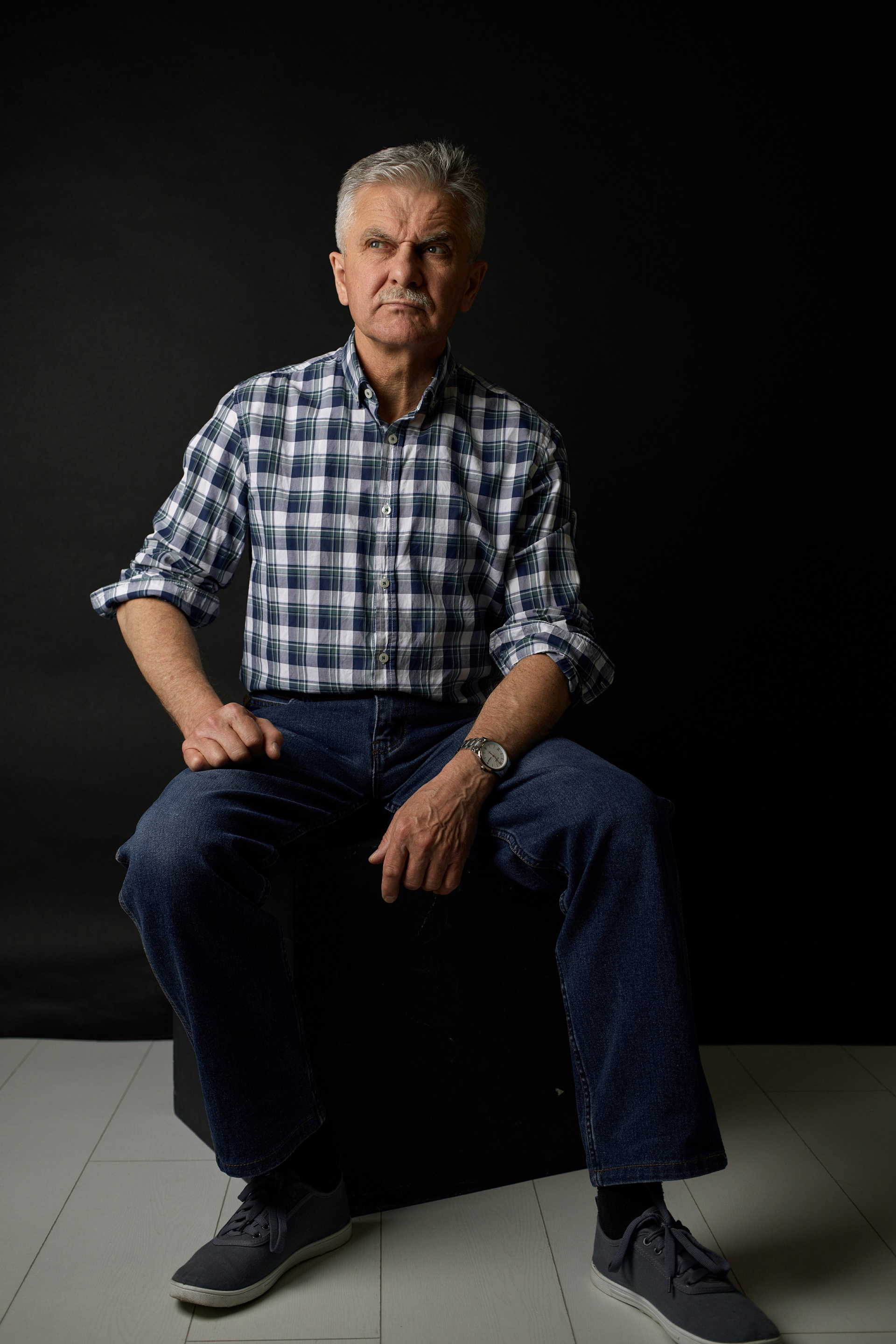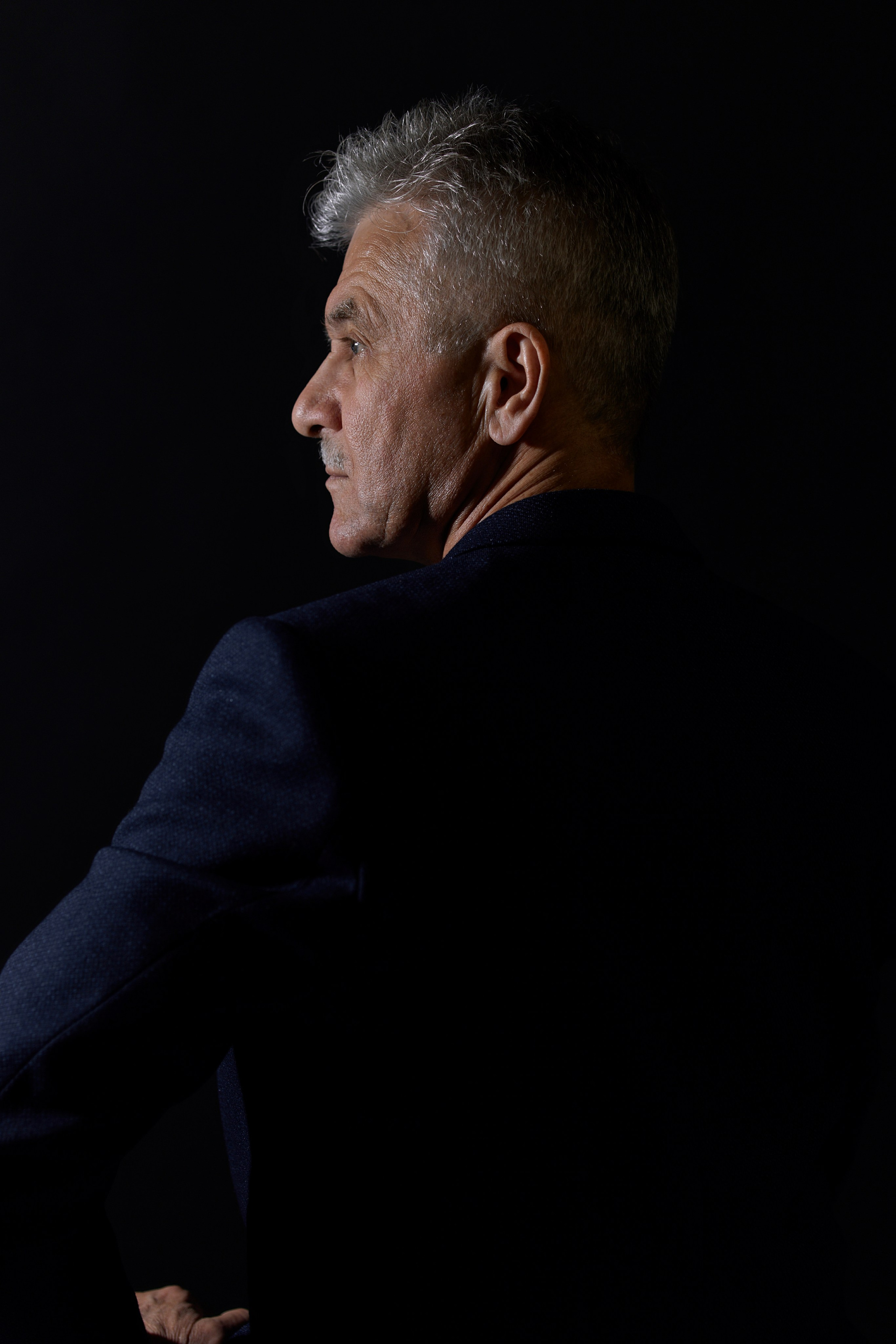 Мы снимали на циклораме — минималистичный фон подчеркивал личность героя и исключал визуальный шум. Дополнительно я использовал черные флаги, чтобы создать глубокий и выразительный фон, выгодно выделяющий Василия на снимках.